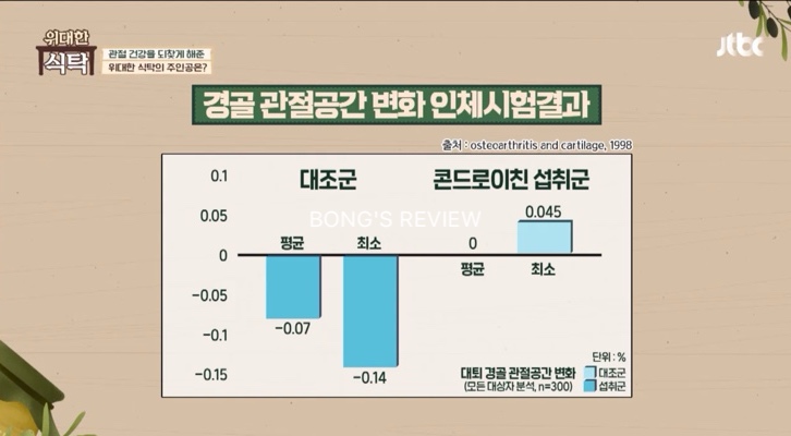 또다른 인체시험에서는 콘드로이친을 섭취한 환자들의 평균 관절 너비가 대조군에 비해 증가한 것으로 나타났다고 합니다.